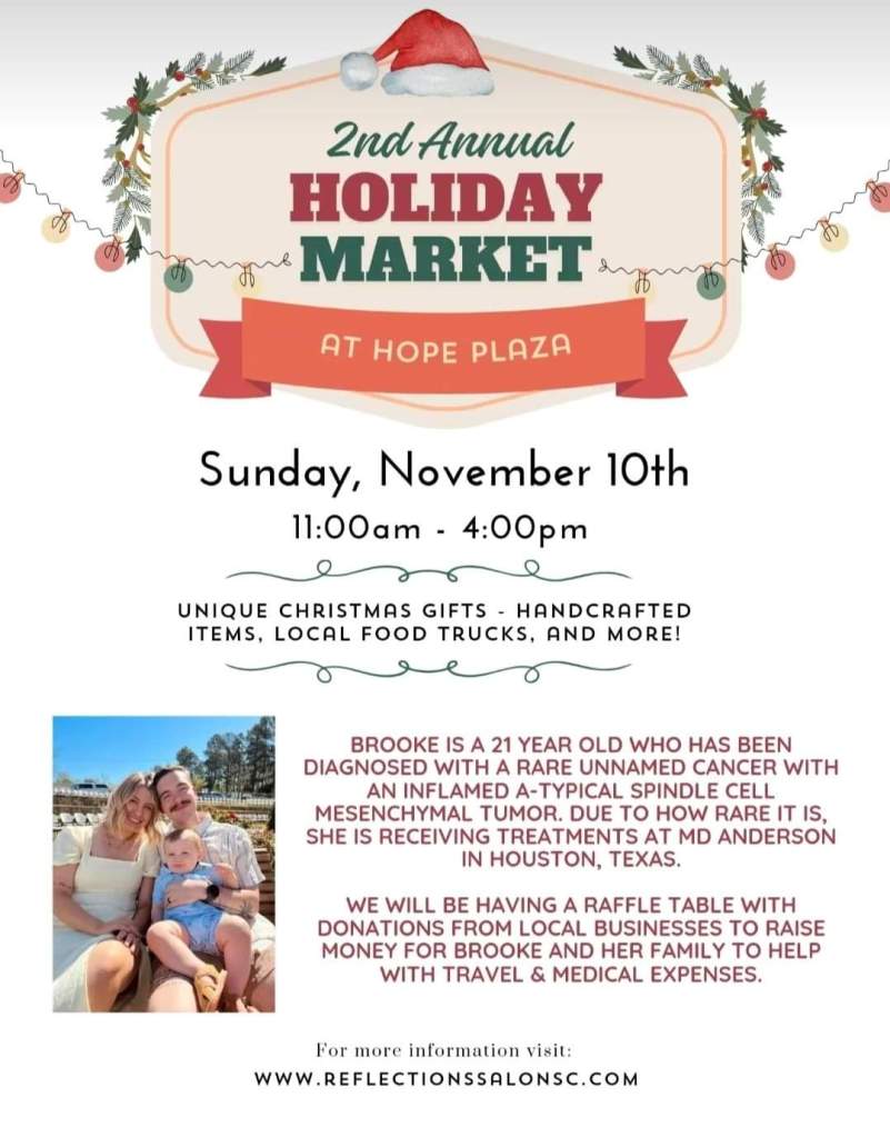 We are gearing up for our 2nd Annual Holiday Charity Market. We would love for you to stop in SUNDAY, NOVEMBER 10th from 11:00-4:00. We will have 19 local small businesses, food trucks and so much more! Bring your friends and family (even your dogs, we will have something for them too!) and come out and support Brooke Corley and her sweet family. We will have a raffle table where tickets will be $5 and all proceeds go to The Corley family. It’s going to be a great time and a good start to the Holiday Season.